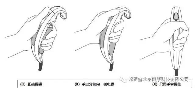 - 按照?qǐng)D示握住手柄電極后,用拇指按開(kāi)始按鈕。