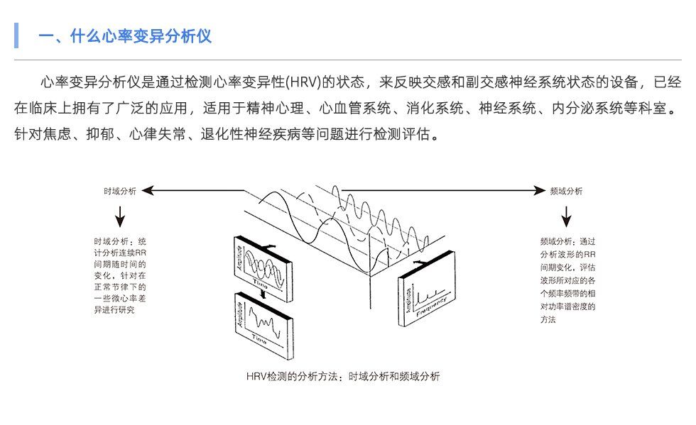 心率變異分析儀于檢測(cè)精神壓力對(duì)自主神經(jīng)系統(tǒng)的影響,在臨床醫(yī)學(xué)上輔助醫(yī)生檢測(cè)由于交感神經(jīng)和副交感神經(jīng)系統(tǒng)紊亂造成的焦慮、抑郁、睡眠障礙等心理問(wèn)題。